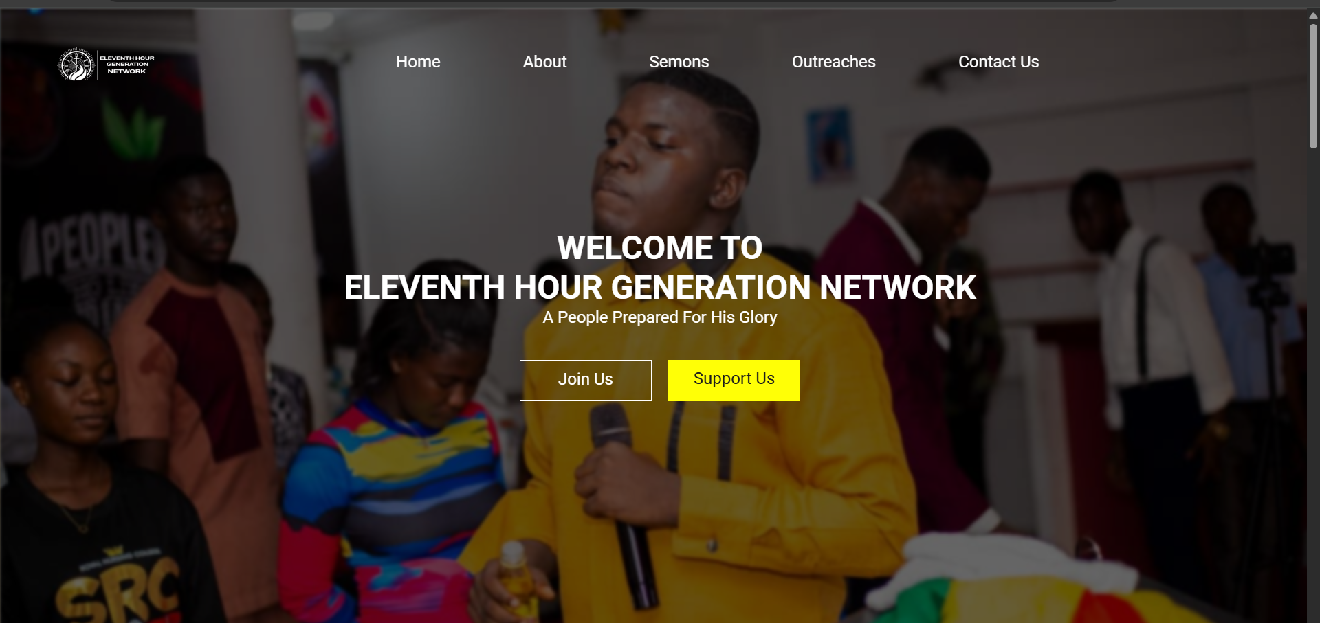 A modern, responsive website for the Eleventh Hour Generation Network (EHGN) church, built with HTML, CSS, and JavaScript to showcase their mission, events, and community resources.